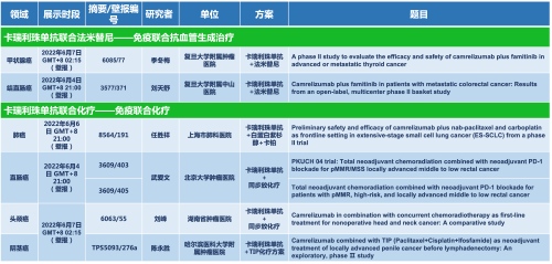 卡瑞利珠单抗联合尊龙凯时医药的另一款创新药法米替尼在甲状腺癌和结直肠癌领域有2项研究被接收为壁报,另有卡瑞利珠单抗联合化疗的4项研究在肺癌、结直肠癌、头颈癌和阴茎癌领域的研究被接收为5份壁报。